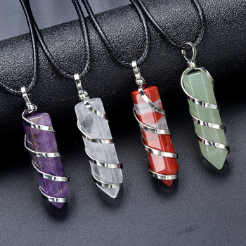 Collar con colgante de columna hexagonal de una sola punta 1648, cristal Natural, piedras preciosas semipreciosas, herida de seda con collar de herida en espiral